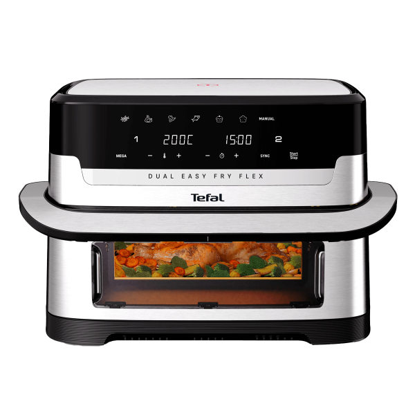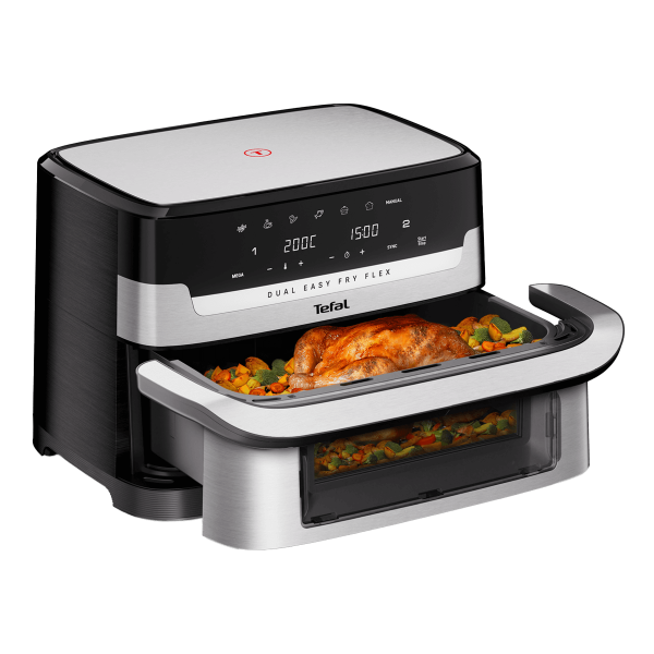 Απόλαυσε υγιεινά, τραγανά και νόστιμα φαγητά με τη Φριτέζα Αέρος Tefal Dual Easy Fry Flex EY922DE0! Με πρωτοποριακό σχεδιασμό Dual Zone, σου δίνει τη δυνατότητα να μαγειρεύεις δύο διαφορετικά φαγητά ταυτόχρονα ή να συνδυάζεις τις ζώνες σε μία ενιαία GiantZone για μεγάλες ποσότητες ιδανική για όλη την οικογένεια. Η XL χωρητικότητα 9 λίτρων προσφέρει άνεση και ευελιξία, ενώ η τεχνολογία Hot Air εξασφαλίζει ομοιόμορφο ψήσιμο με ελάχιστο ή και καθόλου λάδι, για πιο ελαφριά και γευστικά αποτελέσματα. Επιπλέον, με τη λειτουργία FlexCook, η διαδικασία του μαγειρέματος γίνεται πιο εύκολη από ποτέ, προσαρμόζοντας αυτόματα το χρόνο και τη θερμοκρασία, ενώ οι 7 προκαθορισμένες λειτουργίες σου επιτρέπουν να ετοιμάζεις με ένα μόνο άγγιγμα πατάτες, κοτόπουλο, ψάρι, γλυκά και πολλά ακόμη.