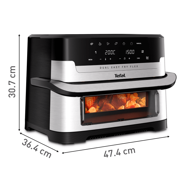 Ακριβώς όπως μια διπλή φριτέζα αέρος, διαθέτει δύο πραγματικά ανεξάρτητα θερμαντικά στοιχεία, προσφέροντάς σου ατομικό έλεγχο χρόνου και θερμοκρασίας για κάθε ζώνη. Έτσι, μπορείς να μαγειρεύεις δύο διαφορετικά φαγητά ταυτόχρονα, χωρίς συμβιβασμούς στη γεύση ή στο αποτέλεσμα.