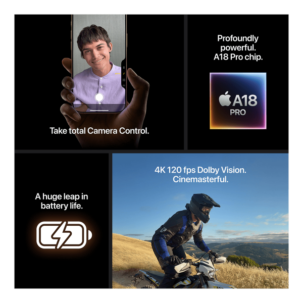 Το A18 Pro chip επιτρέπει προηγμένες λειτουργίες φωτογραφίας και βίντεο, όπως ο Έλεγχος Κάμερας, και προσφέρει εξαιρετική γραφική απόδοση για AAA παιχνίδια. Επιπλέον, το iPhone 16 Pro Max προσφέρει εξαιρετική απόδοση με έως και 33 ώρες αναπαραγωγής βίντεο και φόρτιση μέσω USB-C ή με MagSafe φορτιστή για ταχύτερη ασύρματη φόρτιση. Τέλος, ανέβασε τα βίντεό σου σε άλλο επίπεδο με 4K 120 fps Dolby Vision - χάρη στην κάμερα Fusion 48MP - και μικρόφωνα στούντιο για ηχογραφήσεις υψηλότερης ποιότητας. Έτσι, ένα επαγγελματικό στούντιο βρίσκεται στην τσέπη σου!