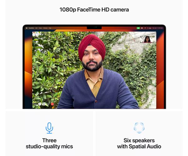 Η κάμερα 1080p χρησιμοποιεί ευρύ διάφραγμα για να εισέρχεται περισσότερο φως και ένα μεγάλο αισθητήρα εικόνας για καλύτερη απόδοση σε χαμηλό φωτισμό. Με διάταξη τριών μικροφώνων ποιότητας στούντιο και λόγο σήματος προς θόρυβο που δεν έχει τίποτα να ζηλέψει από τα μικρόφωνα επαγγελματικού επιπέδου, το MacBook Pro μπορεί να καταγράψει ακόμα και τους πιο διακριτικούς ήχους. Και η κατευθυντήρια προσανατολισμένη λήψη ελαχιστοποιεί τους ήχους στο περιβάλλον σου, για ν' ακούγεται η φωνή σου δυνατά και καθαρά. Ενσωματώνει ηχοσύστημα 6 ηχείων, με τα τέσσερα woofer εξουδετέρωσης ισχύος να προσφέρουν βαθύτερα μπάσα και ήχο που γεμίζει τον χώρο, ενώ τα tweeters υψηλής απόδοσης παράγουν πιο καθαρά και γεμάτα φωνητικά. Και ο Χωρικός Ήχος δημιουργεί ένα εξελιγμένο, τρισδιάστατο ηχητικό πεδίο κατά την αναπαραγωγή μουσικής ή βίντεο με Dolby Atmos.