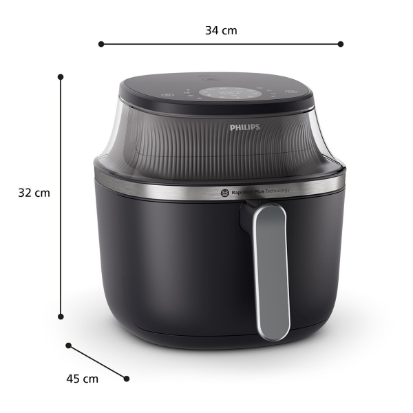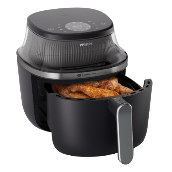 Η PHILIPS Series 3000, αξιοποιεί την προηγμένη τεχνολογία RapidAir Plus, για να σου προσφέρει νόστιμα φαγητά με έως και 90% λιγότερο λίπος. Η πατενταρισμένη τεχνολογία RapidAir Plus, με τον μοναδικό αστεροειδή σχεδιασμό της, κυκλοφορεί τον ζεστό αέρα γύρω και μέσα από το φαγητό με γρηγορότερο αερισμό, εξασφαλίζοντας σου ένα ομοιόμορφο μαγείρεμα τόσο στο εσωτερικό όσο και στο εξωτερικό του φαγητού.
